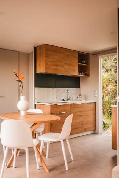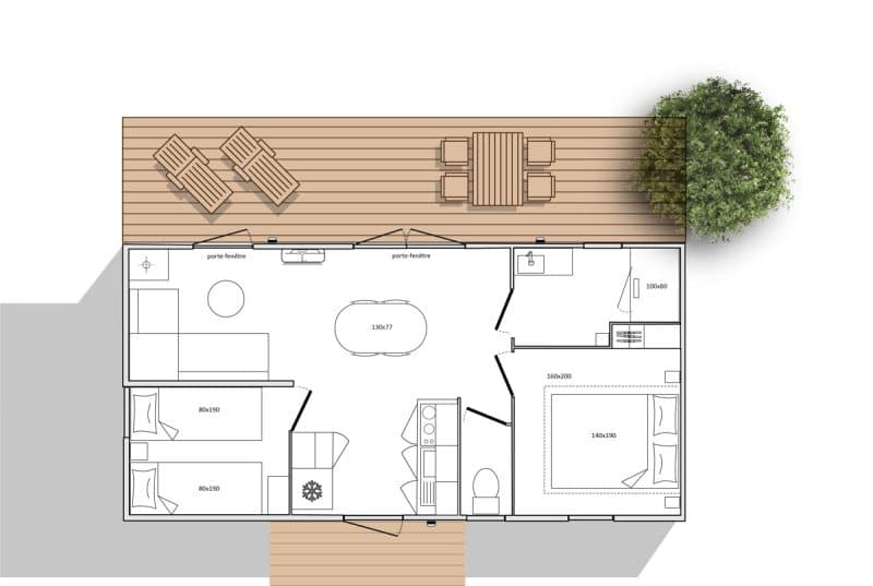 The SYLVA mobile home will seduce you with its double exposure that bathes this modern accommodation in light. Its spacious interior and large terrace in a wooded setting can accommodate up to 4 people.