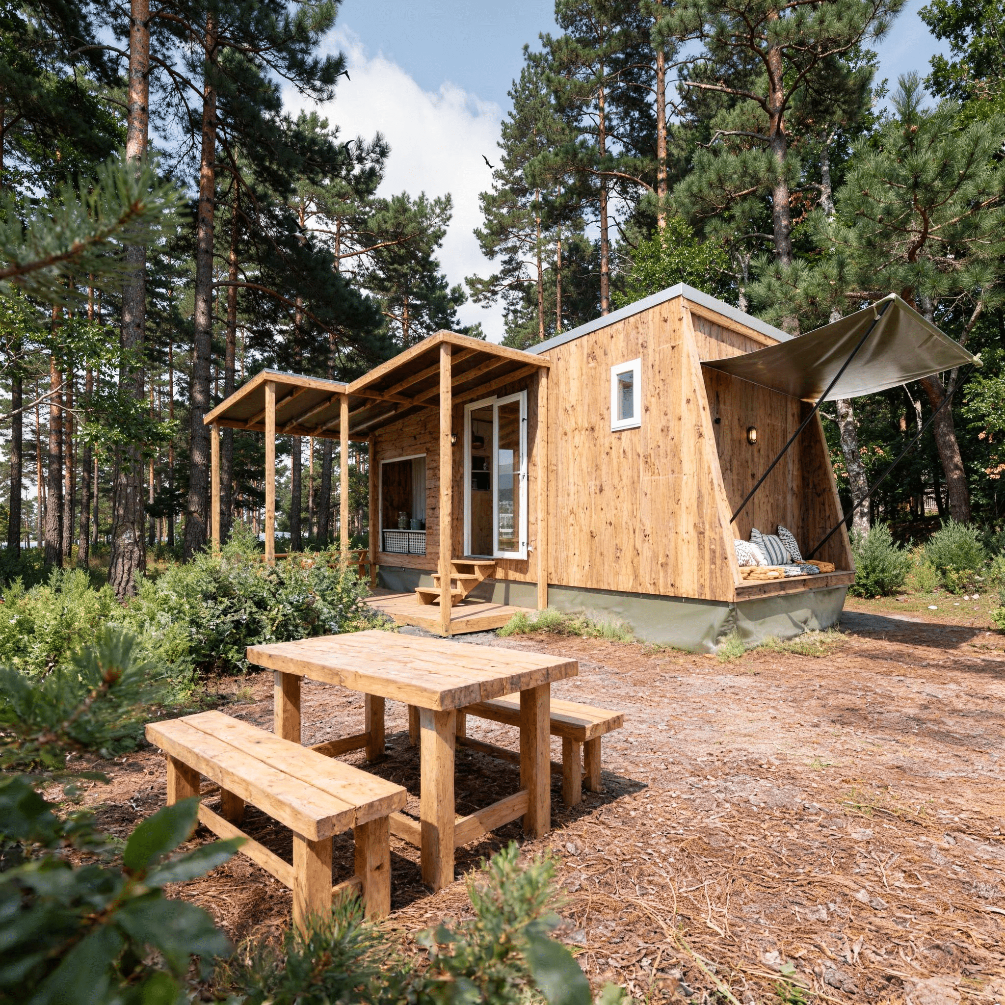 TYRA is an unusual experience: cook indoors in its functional space or outdoors on the plancha. Relax in the garden furniture and enjoy the view of the surrounding forest.